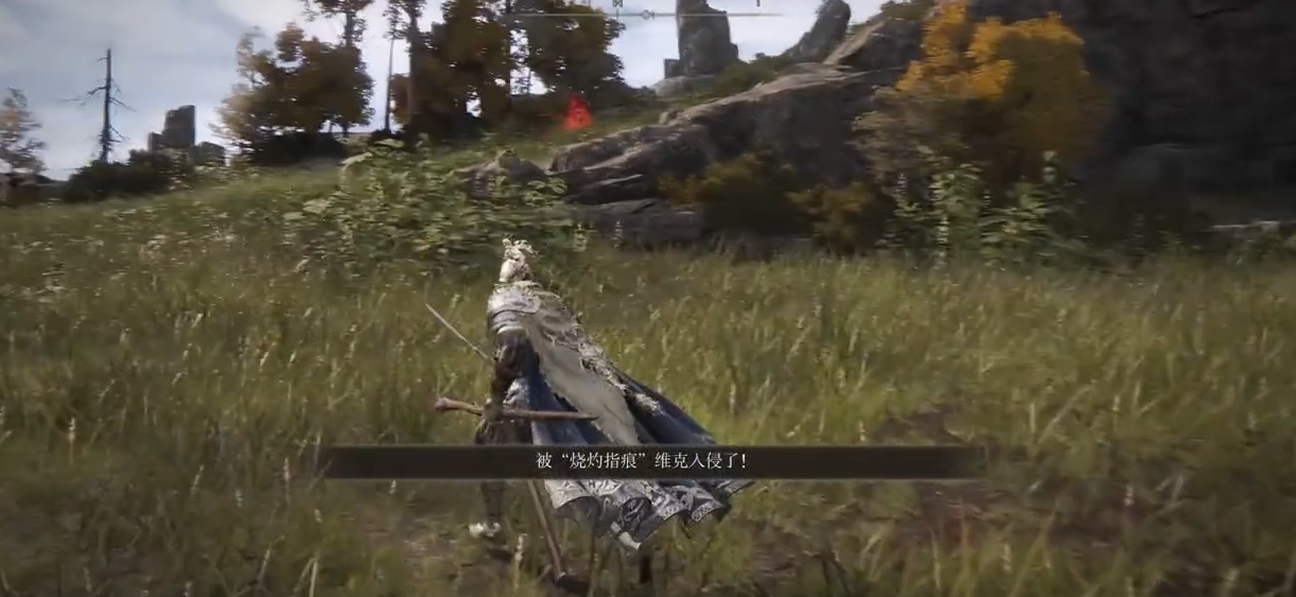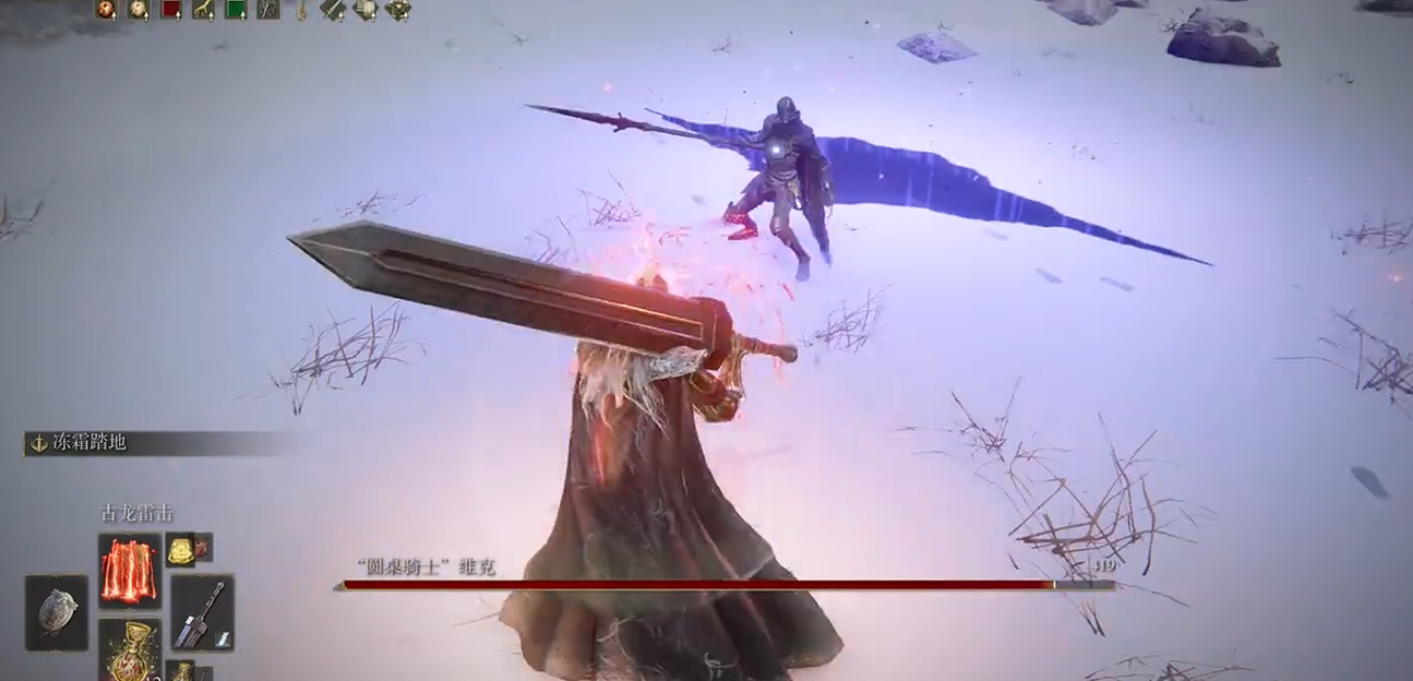 维克的武器配置体现其双重身份特征,右手持龙雷附魔的骑士直剑,剑身缠绕暗红色闪电;左手可释放古龙祷告维克的龙雷,该技能会召唤猩红雷电缠绕全身。战斗姿态中,他常以左手捂头的痛苦动作起手,随后爆发出兼具龙雷之力与癫火特性的混合攻击。其装备细节具有重要叙事功能,指痕铠甲物品描述明确这些痕迹源于他试图成为癫火之王时未完全脱去护甲,导致三指的癫火力量在金属表面留下永久烙印。