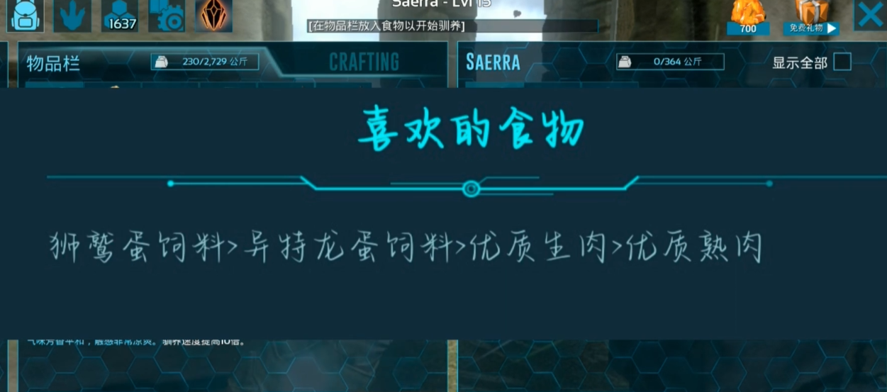 驯服狮鹫,最喜欢的是异特龙蛋饲料,效果最好,其次是优质生肉和优质熟肉,实在没有的话生肉也能凑合。异特龙蛋饲料配方挺讲究,需要异特龙蛋、土豆、优质熟肉干、水、3个纤维和2个紫色浆果。如果运气好搞到了狮鹫蛋,还能做成更高级的狮鹫蛋饲料,配方是狮鹫蛋加优质熟肉、纤维、土豆、玉米、柠檬和虎尾兰种子,最后别忘了加瓶水。记住多准备些饲料,等级越高的狮鹫吃得越多。