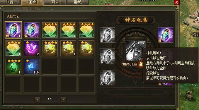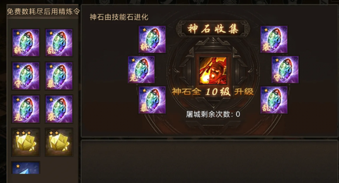 屠城功能与神石系统深度绑定,拥有6颗技能神石后可激活该功能。当目标城池敌军武将数低于5时即可发动屠城,这是高阶玩家快速扩张的重要手段。神石带来的战力加成等效于数千级兵器属性,但需消耗海量宝石资源。6颗40阶晶石进化需约156万宝石,等效加成达2340级兵器属性。这种投入产出比决定了神石系统更适合中后期玩家重点发展。