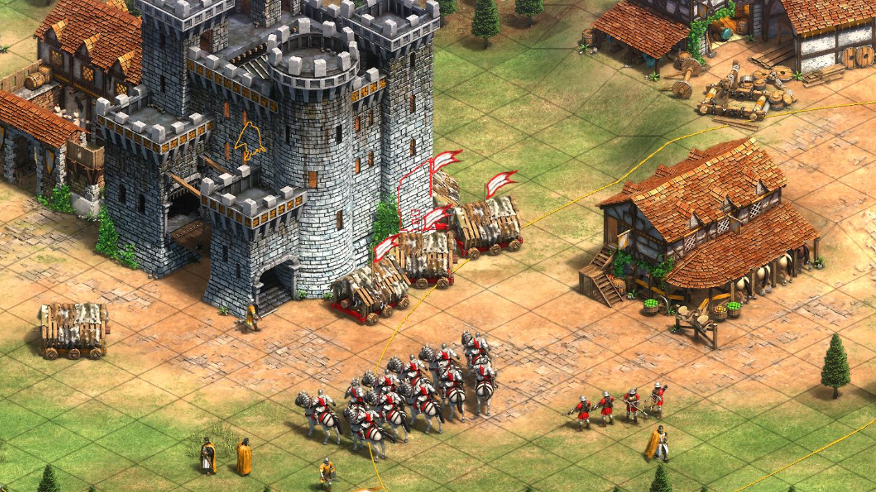 开局咱们会发现自己没有村民和城镇中心,只能依靠盟友提供的资源支援。初始部队包括长枪兵、弩手、骑士和轻骑兵,需要合理编队使用。重点是把弩手驻扎在城堡里增强防御,骑士和长枪兵负责机动防守。记得尽快造个攻城武器厂,生产投石车去压制猛狮亨利的出兵建筑。