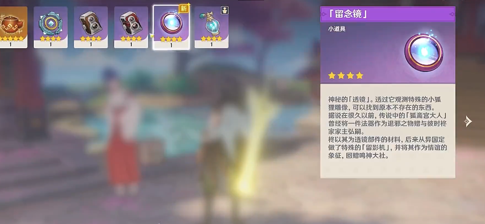 留念镜作为稻妻区域神樱大祓系列任务的关键道具,该道具需要通过完成祭神奏上任务获取,具体流程为完成前置任务绀田事话后,前往鸣神大社与巫女稻城萤美对话即可获得。留念镜主要用于后续探索荒废神社等区域时破解谜题,其功能为显示隐藏的狐狸雕像或特殊机关。