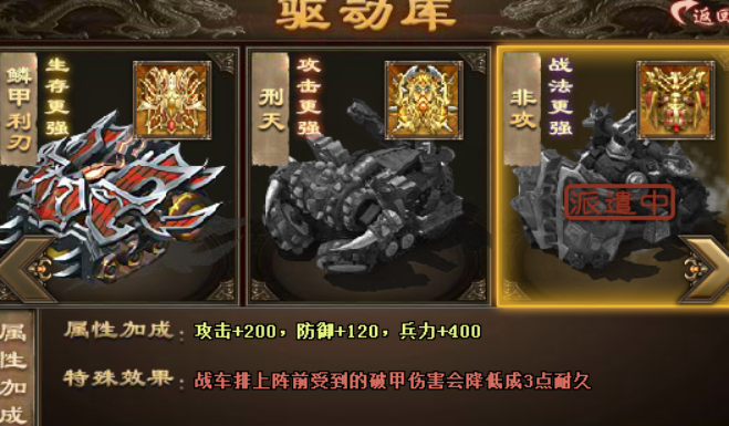 战车在攻城掠地中作为重型单位,其防护能力直接影响战场表现。破甲效果会大幅削弱战车的防御性能,因此需要通过多重手段进行针对性防护。提升战车基础属性是最直接的防御方式,包括消耗陨铁进行战车重铸和改装,通过零件强化提高攻击、防御及兵力等核心数值。当战车完成五辆基础打造后,可进入深度改装阶段,属性加成效果更为显著。