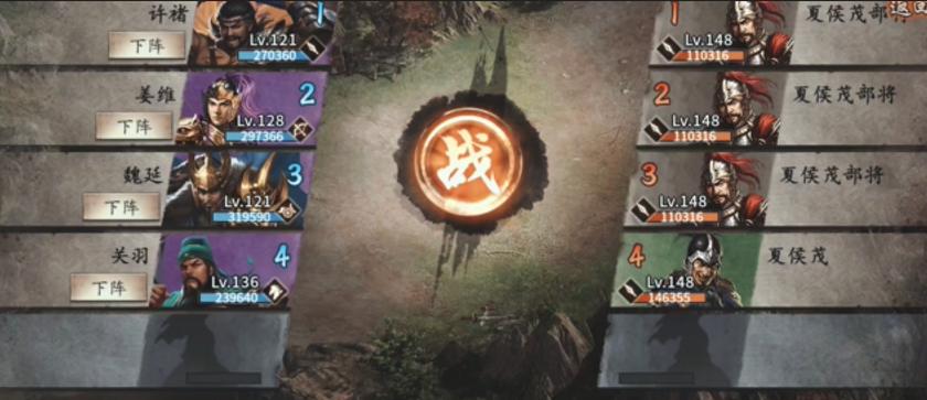 典韦穿极灵龟套放在第三位,主要作用是起手战法封住剩余残兵和夏侯茂的前两排。这里需要注意计算血量,确保能和张飞配合完成收割。张飞穿极烛龙套放在最后,四排满血状态下使用战法很关键。如果前面的武将发挥正常,张飞只需要用三排拼掉一排就能结束战斗。