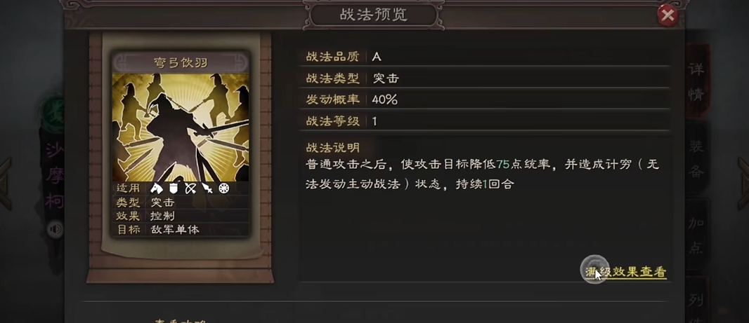 如果你主打控制流,优先选强攻加弯弓饮羽,让咱家关平一回合多砍几次,缴械概率直接翻倍,对面菜刀队直接哑火。要是走暴力输出路线,手起刀落和暗藏玄机最稳,尤其后者打主将还能额外补刀,对付那些脆皮指挥官特别爽。注意战法别带冲突的,比如已经有了缴械效果就别重复带同类控制,浪费格子。
