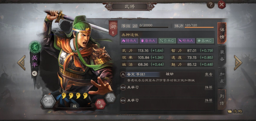 关平虽然属性不算顶尖,但兵种适应性特别灵活,枪兵、盾兵、骑兵都是A级,打架时能根据对手随时切换兵种克制,特别省资源。他的自带战法奋突是关键,普通攻击后能叠伤害,最高3层,还能概率缴械敌人,属于越打越猛的套路。想让他发挥最大作用,战法得围绕连击和突击来配,比如强攻触发连击快速叠伤害,或者手起刀落暗藏玄机这种突击战法补输出,搭配起来效果杠杠的。