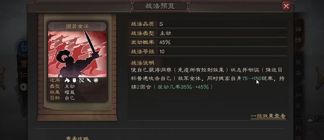 想让曹仁发挥最大作用,战法搭配很关键。推荐给他带魅惑或者后发制人,这样敌人打他的时候还能被反控或者反击,性价比超高。如果资源充足,可以再配个藤甲兵或者锋矢阵,进一步提升队伍的防御或者输出能力。曹仁的主要任务就是吸引火力,所以战法尽量选能增强生存或者反制敌人的。