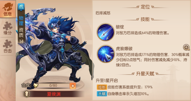 夏侯惇作为阵容的核心输出,其横排攻击附带眩晕效果,对生命值高于50%的敌人能造成额外伤害,是压制敌方血线的关键。典韦则承担主力爆发角色,高暴击属性使其能无视防御打出巨额伤害,但需注意其命中率问题。张辽的减怒效果能有效干扰敌方技能释放,尤其在前排站位时表现突出。夏侯渊则针对后排进行压制,通过减怒和补刀巩固优势。这四名武将的合击技能能进一步提升团队的控制与输出能力。