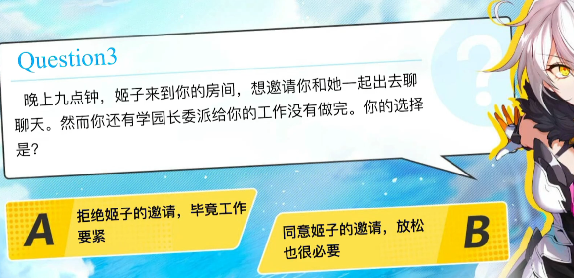 活动页面通常通过游戏内公告入口进入,属于网页形式。选择女武神时可能出现延迟,耐心等待结果刷新。部分热门角色如冰卡需要AAABBBB的选项组合,勿忘则是AABBABA,月轮要选BBBBAAA。如果中途想换角色,重新答题即可覆盖之前的选择,但最终只能保留一位女武神。