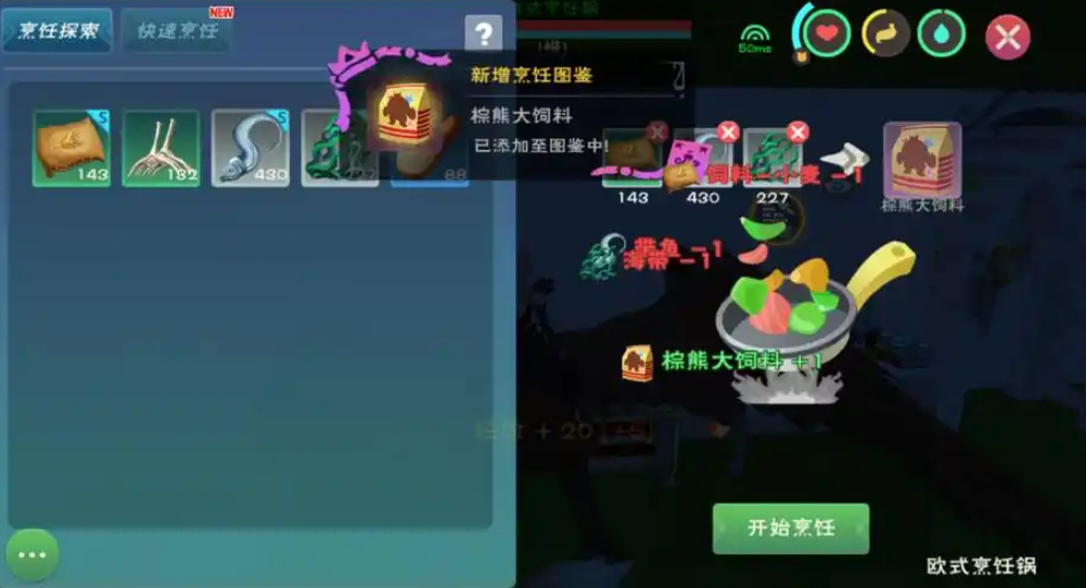最后一步是把饲料-小麦包、饲料-蜂蜜包和甘蔗组合成雪原熊饲料包。靠近烹饪台,放一个饲料-小麦、一个饲料-蜂蜜和一根甘蔗进锅里,点一下制作按钮就好。找到雪原熊后,靠近它投喂饲料,边喂边互动,慢慢就能建立信任驯服成功。