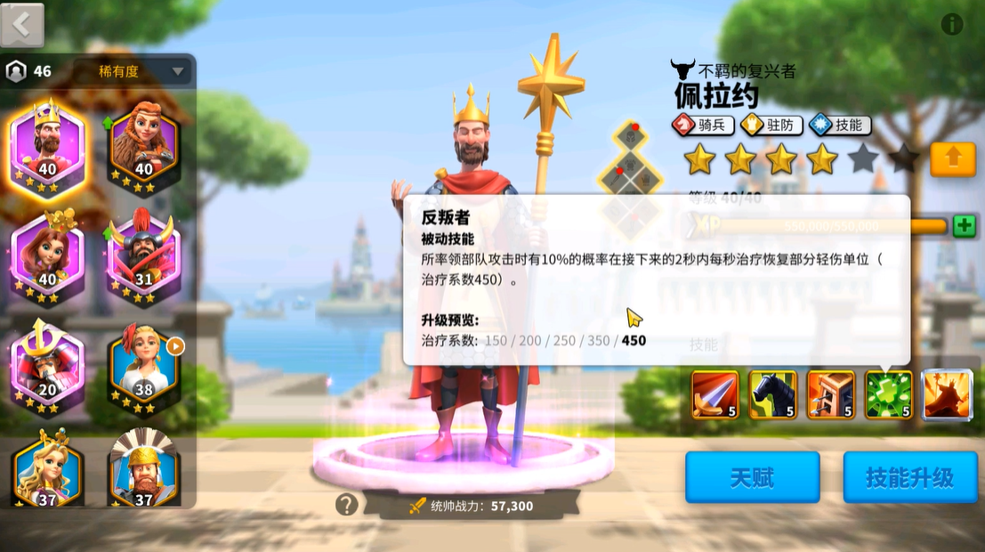 佩拉约作为骑兵统帅的核心被动技能是阿斯图里亚斯之祖,这个技能能让你带领的骑兵攻击力和防御力直接提升10%,觉醒后效果更猛,直接拉到15%。别看是史诗级武将,这加成在前期相当够用,和传说武将萨拉丁20%的加成差距并不大。二技能的回怒机制也很实