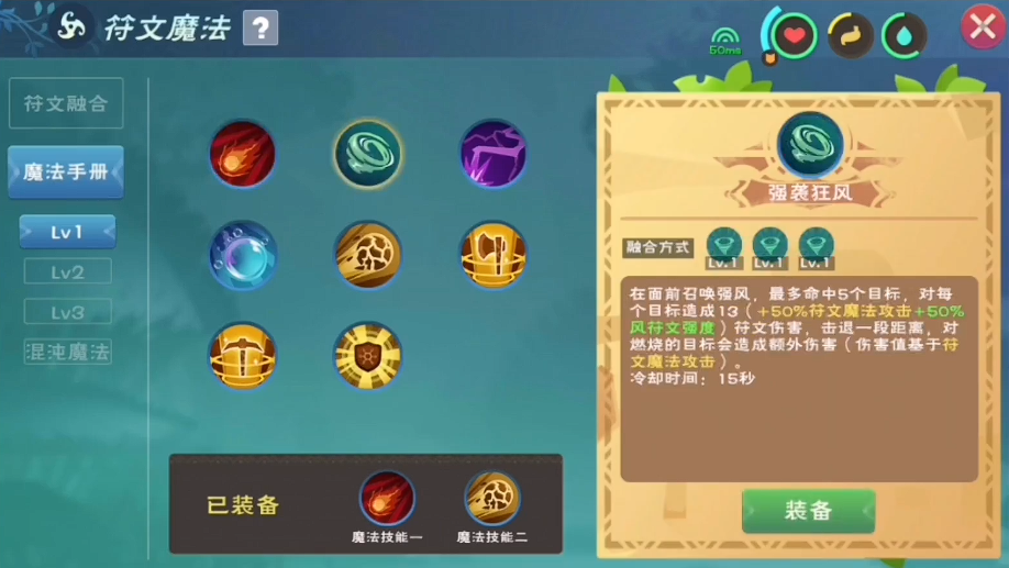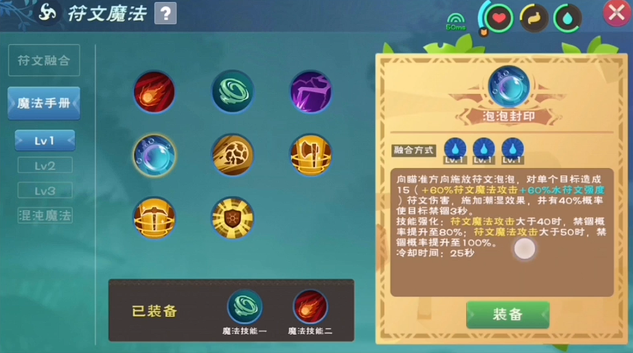 除五级魔法外,游戏内其他等级魔法也有独特机制。例如三级魔法狂澜季风由水风雷三元素合成,能对潮湿目标造成额外伤害;八级魔法岩霜领域需三水三土元素,结合了禁锢与减速效果。这些魔法虽功能各异,但均遵循元素组合逻辑,水元素多与控制相关,火元素偏向伤害,风元素常带位移或增益效果。