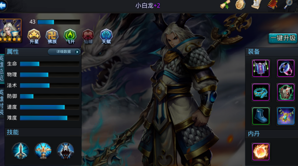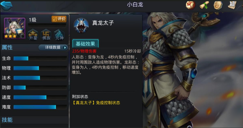 小白龙定位为兼具控制与爆发的战士角色,其核心优势在于双形态切换机制。人形态下技能以物理伤害为主,龙形态则转为法术伤害,两种形态技能独立计算冷却时间,实战中可形成六技能循环。关键技能猛龙出海具备突进与击退效果,龙战于野提供护盾与聚怪能力,而大