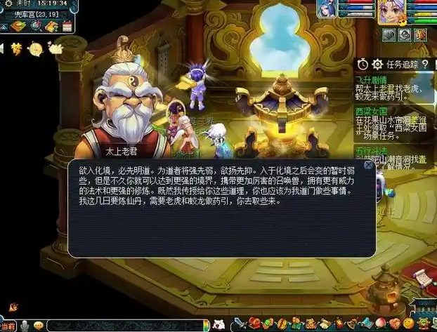 飞升任务分为仙族、人族、魔族三线流程。仙族任务需依次完成李靖(天宫)、齐天大圣(花果山)、东海龙王(龙宫)、观音(普陀)、镇元大仙(五庄观)、二郎神(凌波城)的试炼,其中涉及拼图游戏、光武上交、黑熊精战斗等环节。人族任务需通过程咬金(大唐官府)、法明长老(化生寺)、孙婆婆(女儿村)的考验,包括剿匪、治愈瘟疫NPC及徒步送信。魔族任务则需与牛魔王(魔王寨)、天女魃(女魃墓)、大大王(狮驼岭)等交互,提交召唤兽、高级兽决等物品。任务过程中需注意必败战斗(如心魔战)无需强行取胜,部分任务存在随机性要求如三药、暗器等,建议根据系统提示动态准备。