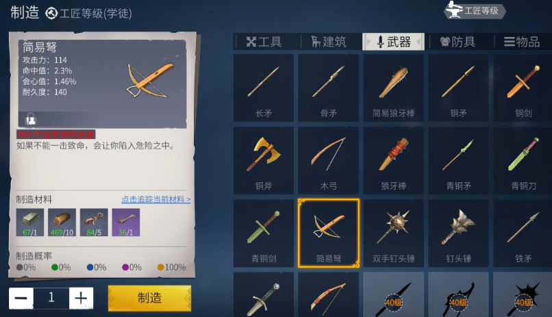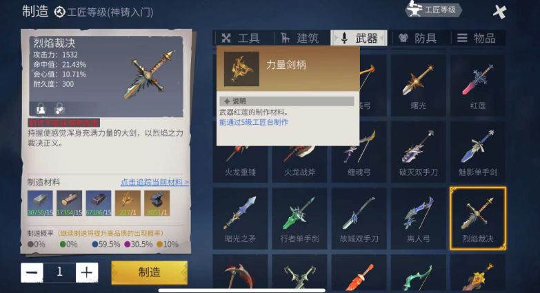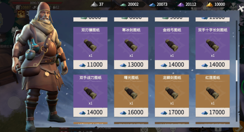 冰原守卫者中的武器图纸系统是游戏核心玩法之一,玩家需要通过等级解锁和材料收集来获取各类武器制作能力。最早可解锁的武器图纸是20级的青铜大剑,需要500回收材料,但该武器攻速较慢且存在明显前后摇,前期实用性较低。30级阶段可解锁双手重齿刀(1000材料)和单手剑(2000材料),后者作为30级单手武器中属性最高的选择,是前期值得优先制作的金色品质武器之一。