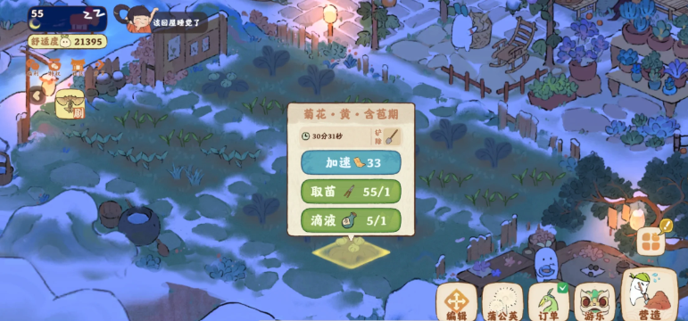 花圃修复后,玩家进入培育界面,可以选择不同花卉种子进行种植。花卉培育过程分为三个阶段:种子、花苗和成花。初始阶段,玩家将种子播入花圃,种子随后发芽进入花苗阶段。在此阶段,玩家可通过浇水或施肥减少花苗成熟时间,同时帮助其他玩家的花苗进行这些操作时,有几率获得相同种类的种子作为回报。花苗成熟后转化为成花,标志着培育完成。