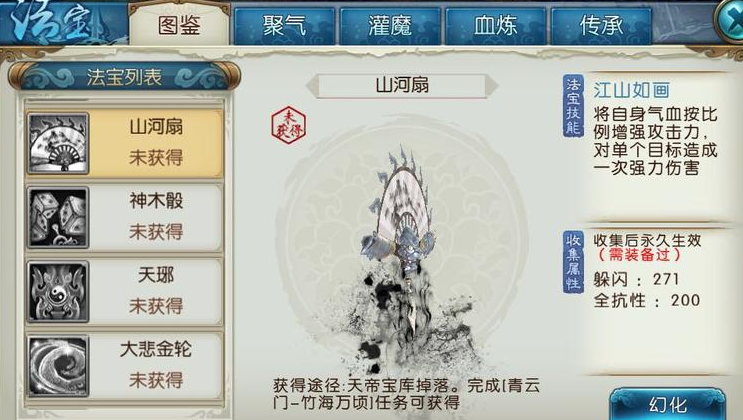 合欢作为高爆发、高机动的单体输出职业,法宝选择的核心思路是强化暴击和单体伤害。前期推荐使用山河扇或神木骰过渡,这两件法宝自带暴击属性,山河扇的技能与血量挂钩,血量越高攻击越强,非常适合挂机刷怪。中期可以转向天琊或紫芒刃,天琊能放大8秒内对单