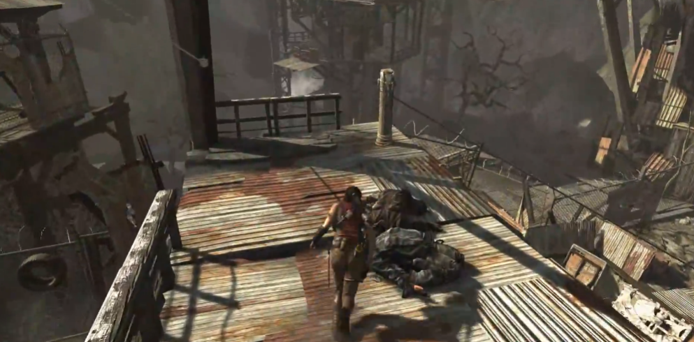 往前走会遇到敌人追击和体力消耗的机制,记得先躲在掩体后恢复状态再迎战。转角处有个拿冲锋枪的敌人,解决后用绳索把飞机甲板拉下来。附近油桶和汽油罐可以点燃,对着敌人脚下射击能快速清场。战斗结束后记得往右走找营火回复体力,接着用生存本能确认路线,第四个古墓入口就在附近。