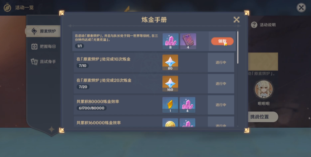 活动还提供一次性成就奖励,包括300原石、6个元素断片、10万摩拉、23万武器经验和23万角色经验。其中元素断片价值约60树脂,武器经验与摩拉兑换比为2:1,23万武器经验等价于11.5万摩拉。这些奖励对角色培养和资源积累具有显著帮助,尤其适合需要快速提升角色等级的玩家。