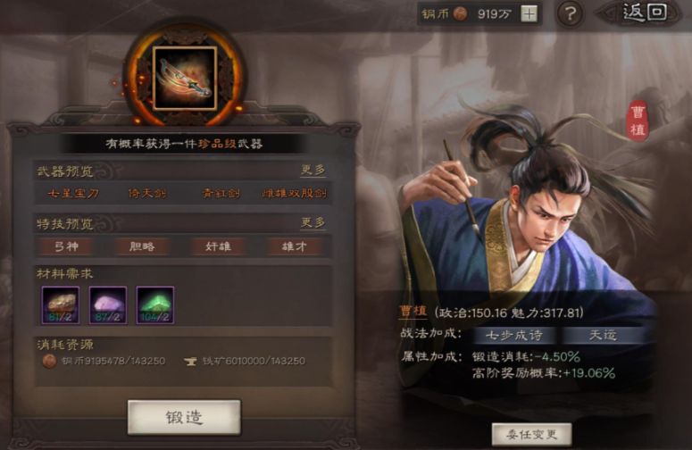锻造功能依托于铁匠铺,玩家需将君王殿升至6级后方可建造。铁匠铺等级直接关联可锻造装备的品质上限,提升其等级是获得高级装备的必要条件。锻造消耗的核心资源是材料与对应图纸,这两者主要来源于讨伐贼寇活动以及寻访玩法。玩家达成汉室衰微成就后,讨伐贼寇将成为更稳定高效的材料来源。委任拥有相关内政加成的武将作为锻造官,能有效节省材料消耗并缩短锻造所需时间,这是优化资源配置的关键环节。材料积累的效率直接决定了玩家尝试锻造的次数与追求高品质装备的资本。