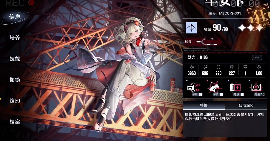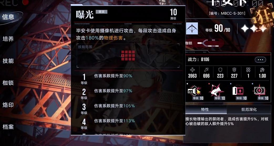 毕安卡是游戏中的一名狂厄级禁闭者,其职业为精准系,擅长造成物理伤害。她的基本攻击名为曝光,运用摄像机进行普攻,每次造成相当于自身攻击力一定百分比的物理伤害。她的核心机制围绕着必杀技视野中心展开,激活后,普通攻击会转化为聚焦模式,攻击节奏变慢