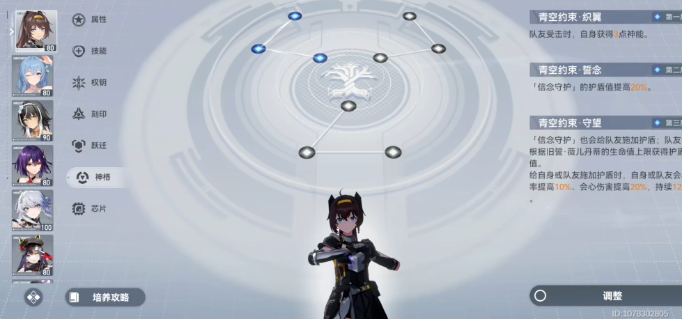 神格路线的选择是塑造旧誓战斗风格的核心决策。她的三条神格线提供了截然不同的发展方向。选择侧重输出的永命垂线,可以大幅缩短格挡准备时间,并使成功格挡后获得额外神能与伤害提升,最终还能重置护盾技能的冷却,这条路线对玩家的格挡时机把握能力有一定要求,但能将防御转化为高额伤害。若更倾向于团队保护,则应选择青空约束,它能直接提升护盾值并为全体队友附加护盾,显著增强队伍在面对高强度攻击时的稳定性,操作门槛相对较低。而神铁之盾路线则为盾牌投掷附加了眩晕控制效果,并能通过弹射积累神能,这条路线提供了宝贵的群体打断能力,在应对复数敌人或需要打断敌人关键技能时具有战略价值。