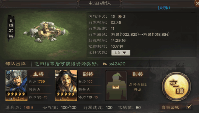 进攻过程中的细节处理直接影响最终战果。部队抵达目标地附近后,不要立即开战,应先进行驻守,等待士气值恢复至100点再发起攻击,此举能有效避免因士气低落带来的伤害衰减,从而显著降低战损。战斗开始后,主力队率先接敌。你需要密切关注战况:若主力队与敌方第一队战斗后剩余兵力低于1000,可派遣补刀队进行收尾;若在与第一队或第二队战斗中陷入僵局或呈现较大劣势,应及时派遣清扫队上场支援,以保全主力。在目标选择上,应优先攻打己方紧缺的对应资源地,例如急需升级建筑时可以选择石头地,占领后便于立即屯田以补充资源。可以考虑在敌方同盟活跃度较低的时段,如深夜或清晨发起进攻,以减少被其他玩家干扰或抢地的风险。