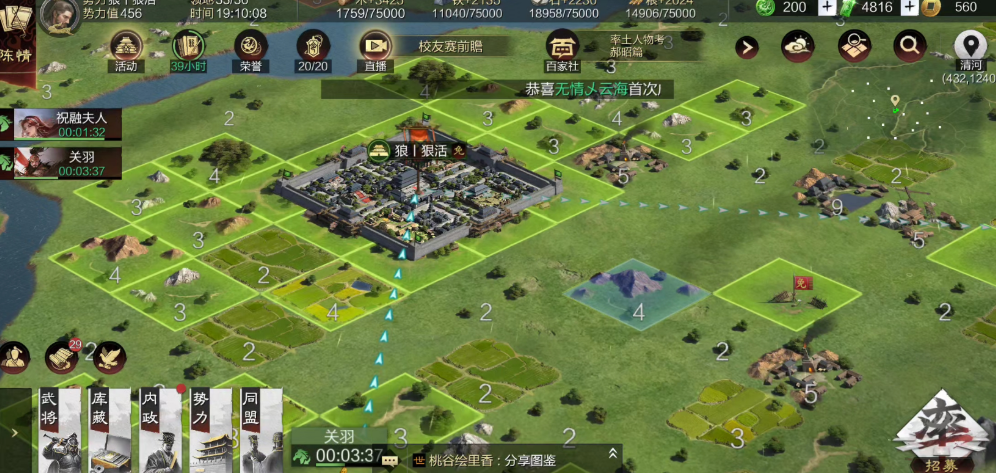 后期40级武将升级靠刷城中心最效率。找个盟友留的低级城,连续打7-8场只用20体力,经验涨得飞快。注意避开9级以上城池,守军强度会陡增。如果体力充足,每天8点蹲经验书刷新,派武将直接领取不打架,轻松补经验缺口。练兵选高级地收益更高,每次消耗20体力和3个法令,配合任务奖励经验叠加更划算。加入同盟是打城的核心,不仅能共享视野和领地,还能协调多支部队同时进攻。攻城时主力先清守军,拆迁队紧跟拆耐久,别上错队伍。打完第一波记得用虎符回要塞补兵,再根据战况决定是否继续。打城不是单打独斗,听指挥统一行动才能高效拿下目标。