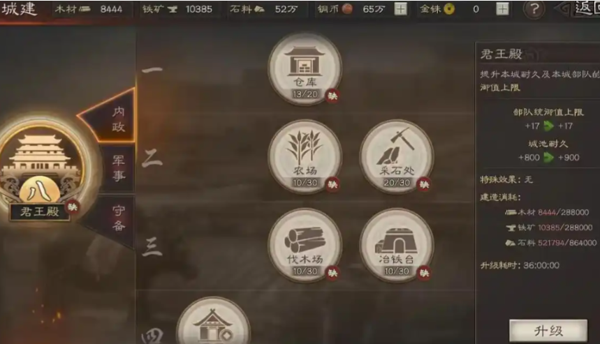 城建系统中的军营升级对兵力提升帮助很大。在主城的军事栏目里找到军营,升级后可以直接提高所有武将的带兵上限。军营需要君王殿达到7级才能解锁,所以前期要优先升级君王殿。兵营、演武场等建筑也能间接提升兵力,比如练兵场可以快速提升武将等级,从而增加带兵数量。城建虽然需要消耗资源,但长期来看收益非常高。