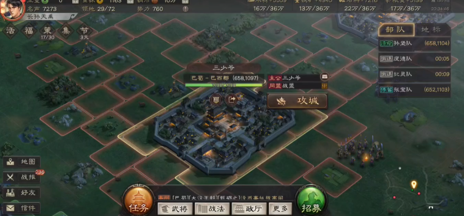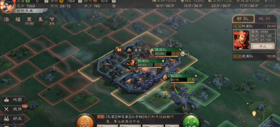 游击军的弱点在于他们无法自给自足,必须不断掠夺才能维持资源供给。咱们可以采取围堵策略,用拒马和营帐封锁他们的行动路线,同时利用太守功能调集部队进行围剿。重点是不让他们有机会出去掠夺,一旦他们拆拒马,就立刻派兵拦截。游击军的主城耐久被打到零后会被随机驱逐,但别急着彻底消灭,留着他们反而能拖慢他们的发育节奏,因为重新起兵需要24小时冷却,迁城更是要48小时,这段时间足够咱们进一步压制。