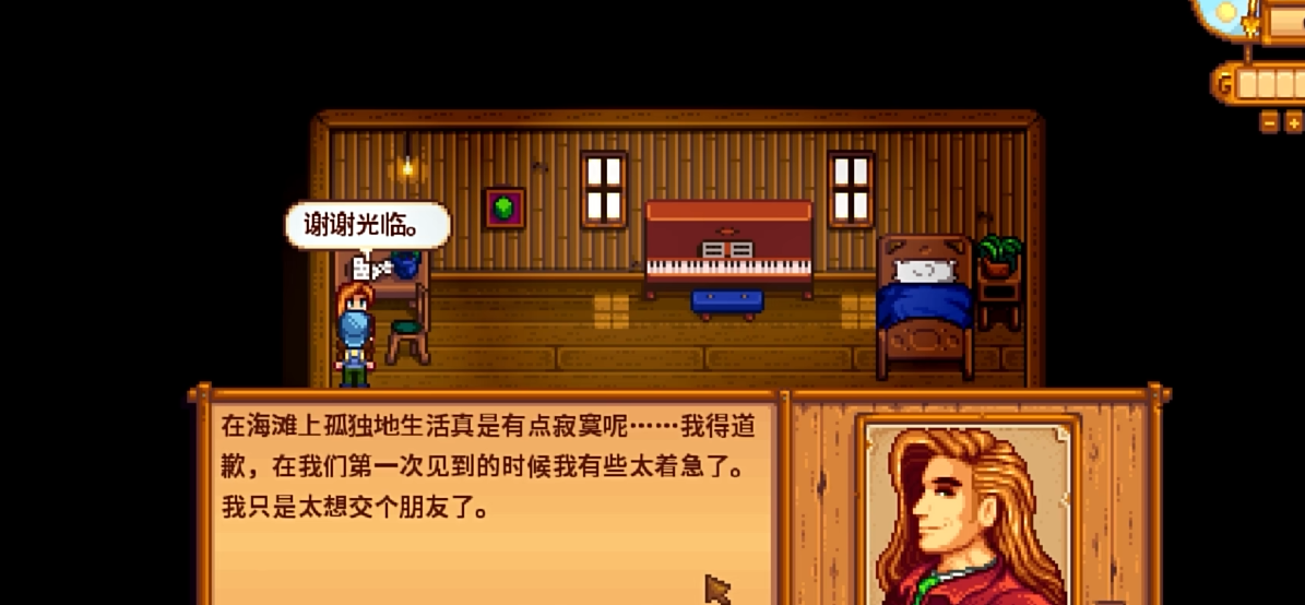 这家伙是个浪漫的作家,最爱龙虾、鸭毛和石榴,每周送两次这些礼物能快速提升好感。千万别送披萨或浮木油,他会嫌弃。好感度够了就能进他家参观,里面摆满书架和手稿,还能触发特殊剧情,比如看他弹钢琴或聊小说灵感。