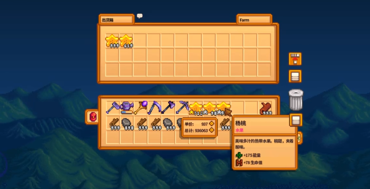 最赚钱的方式就是把杨桃酿成果酒再卖掉,直接卖果实的收益完全比不上酿酒。一颗普通杨桃直接卖只能拿到750金币,但酿成酒后价格直接飙到2250金币,翻了整整三倍!如果运气好种出紫星品质的杨桃,酿出来的酒甚至能卖到4500金币,简直是农场里的黄金液体。