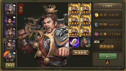 战斗开始时,甘宁先手放战法,尽量打掉曹操第一个部将的三排兵。接着徐晃上场,用克制技能慢慢磨掉第二个NPC,剩最后一排时再放战法。马超这时候就要发挥作用了,如果能连续触发抵挡和暴击,就能多打几排兵。许褚最后收尾,专门对付曹操,记得留战法格挡他的技能。如果甘宁等级不够,可能会有点吃力,所以平时多攒资源提升他。