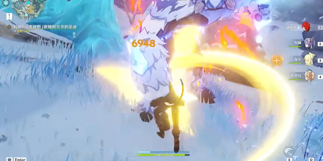 拿到三个碎片后,跟着任务山中之物的指引爬到雪山山顶。这时候会发现山顶又被冻住了,需要再找三个深赤之石打碎坚冰。第一个深赤之石在丘丘王附近,另外两个得靠风场飞过去拿。全部打碎后,冰本秘境芬德尼尔之顶的大门就会解锁,靠近就能开启挑战了。