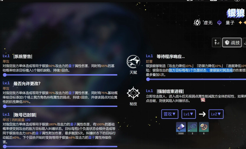 银狼作为量子属性虚无命途角色,其核心机制在于战技的弱点植入能力,加点优先级应遵循战技>终结技>天赋>普攻的原则。战技是银狼最具战略价值的技能,能为敌方单体附加我方队伍持有的属性弱点,同时降低目标20%全属性抗性,升级可显著提升基础概率,缓解效果命中词条压力。终结技作为主要输出手段,提供高额减防效果且伤害可观,建议次级提升。天赋虽能附加随机缺陷状态,但收益相对有限,资源不足时可暂缓升级。普攻仅用于战技点补充,前期可不点,后期资源充裕再考虑。