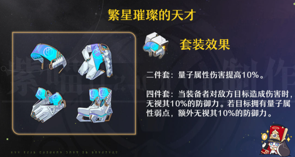 遗器搭配方面,繁星璀璨的天才四件套与泛银河商业公司二件套为通用选择,前者提供量子伤害加成和防御穿透,后者通过效果命中转化攻击力。主词条推荐效果命中躯干、速度或攻击力鞋部、量子伤害球及能量回复绳,副词条优先效果命中与双暴属性。光锥首选专武雨一直下,下位替代可选活动光锥新手任务开始前或决心如汗珠般闪耀,兼顾命中与能量循环。