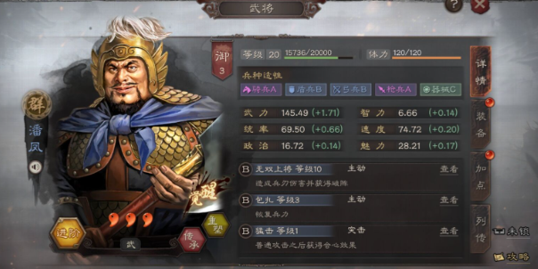 潘凤作为一名三星武将,其核心战法无双上将具备独特的破阵效果,能无视敌方目标的统率和智力,直接对武力最高的敌人造成高额兵刃伤害,这一特性使他在特定场景下成为平民玩家的潜力股;该战法的发动概率仅为25%,且潘凤自身统率低、智力差,生存能力较弱,
