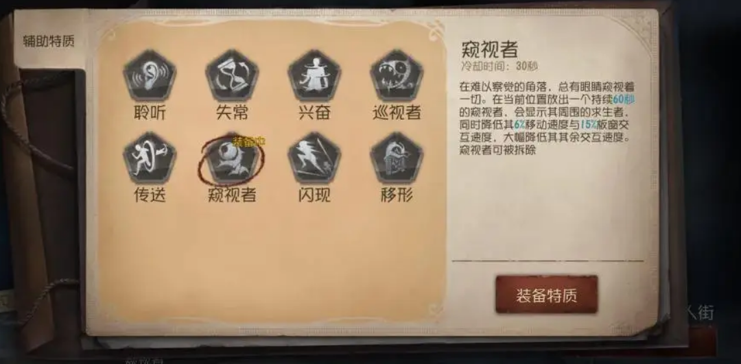 必点挽留提升开门战容错率,清道夫帮助定位治疗中的求生者,无人生还加快攻击恢复速度。封窗和破坏欲可强化板窗区博弈能力,底牌则提供后期切换辅助特质的灵活性。辅助特质首选传送,适用于大型地图快速转点;小型地图可带窥视者弥补视野不足。禁用角色优先考虑先知和祭司,前者役鸟会大幅延长追击时间,后者超长通道干扰控场节奏。