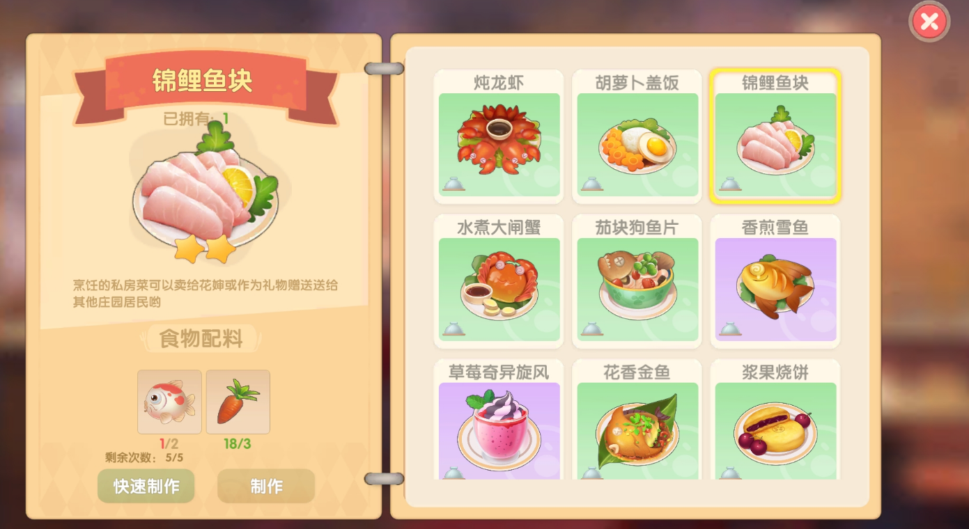 钓到的锦鲤可以做成锦鲤鱼块或锦鲤鱼生这类料理,需要的食材都很容易收集。如果暂时钓不到,也可以问问好友能不能互换特产,毕竟摩尔庄园的核心就是互相帮助嘛。保持轻松的心态,享受钓鱼的悠闲时光才是最重要的!
