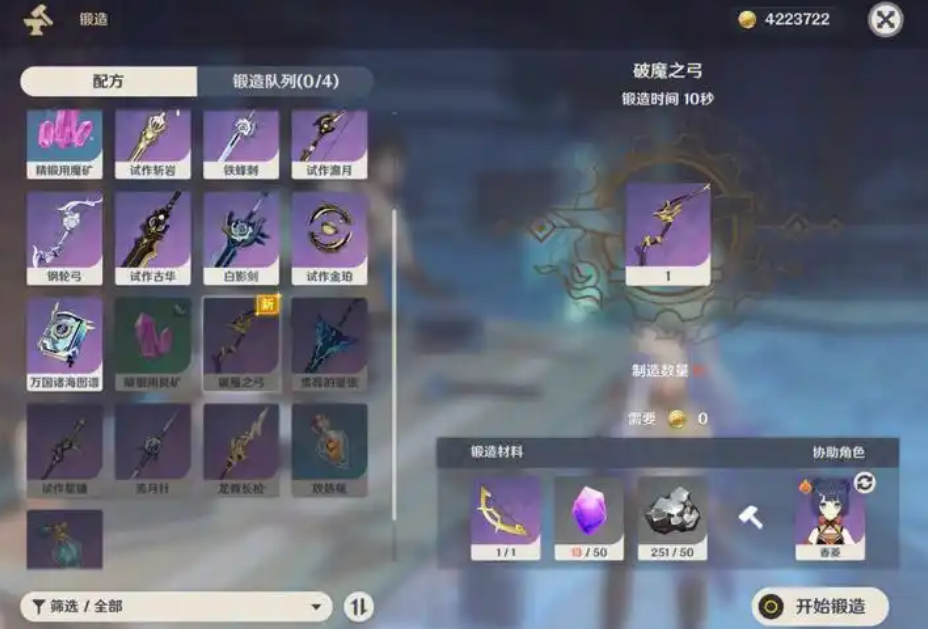 破魔之弓是原神中一把可通过锻造获取的四星武器,其核心获取条件包含两个关键步骤:完成踏鞴物语系列任务终章,以及连续7天在海螺屋开启宝箱。最终在第8天开启的宝箱中将固定获得破魔之弓的锻造图纸,随后玩家需准备1个北陆弓原胚、50个紫晶矿和50个白铁矿在铁匠铺进行锻造。