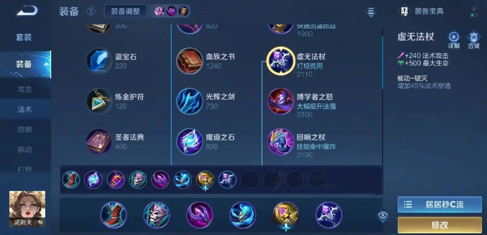 出装方面,我们建议按照阶段来调整装备,前期核心是冷却鞋搭配痛苦面具,冷却鞋能让你更快地释放技能,痛苦面具则提供法术穿透和额外生命,增强你的生存和消耗能力。中期重点转向输出提升,回响之杖是个好选择,它不仅增加法术攻击,还能通过被动效果在技能命中时触发小范围爆炸,让你在团战中更容易打出AOE伤害,接着补上博学者之怒来大幅提升法术强度,让你的技能伤害产生质变。后期根据战局灵活选择,如果敌方魔抗较高,虚无法杖的法术穿透必不可少,贤者之书则能同时增加生命和法强,提高你的容错率,这样一套出装下来,你能在中后期主宰战局。