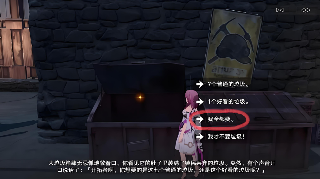 触发垃圾桶互动后会进入对话选择环节,系统将提供三个不同选项。第一个选项涉及信用点交易,选择后需要支付1000信用点才能继续;第二个选项会引发战斗事件,建议提前调整队伍配置;第三个选项可直接跳过当前互动。若选择支付信用点,垃圾桶会掉落一个战利品宝箱,内含20星琼和20里程。该互动每日仅能触发一次,重复尝试不会获得额外奖励。