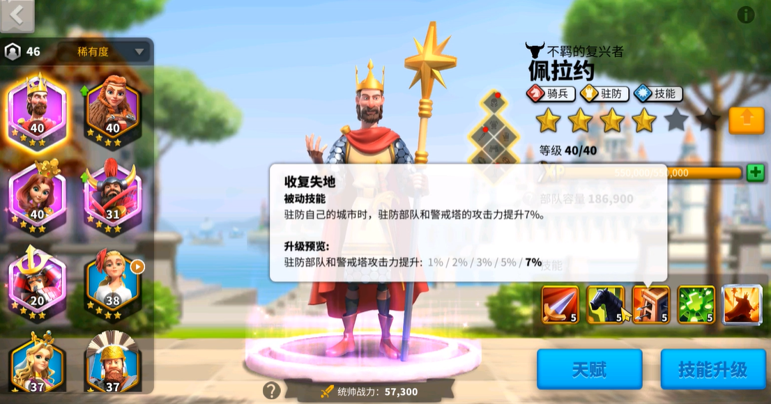 佩拉约作为骑兵统帅的核心被动技能是阿斯图里亚斯之祖,这个技能能让你带领的骑兵攻击力和防御力直接提升10%,觉醒后效果更猛,直接拉到15%。别看是史诗级武将,这加成在前期相当够用,和传说武将萨拉丁20%的加成差距并不大。二技能的回怒机制也很实