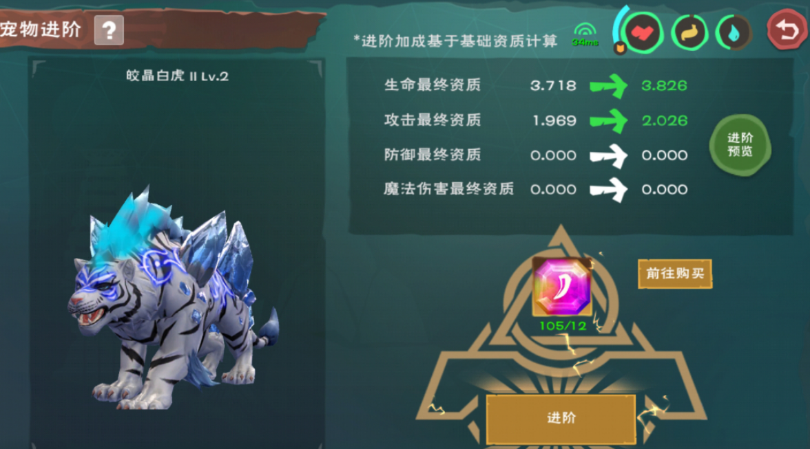 融合过程中需注意宠物资质对最终成品的影响。除第一步融合的岩虎资质随机外,后续步骤的成品资质均与材料宠物相关。建议选择高生命与攻击资质的宠物作为融合材料,以提升皎晶白虎的战斗力。融合魔法石可通过天空商店、家园商店或宠物养成兑换获取,每周刷新数量有限,需提前规划资源。