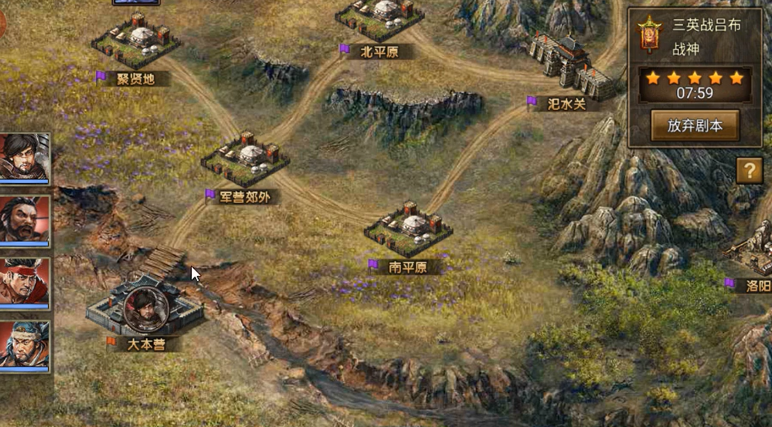 三英战吕布剧本的核心通关路线为单一线性推进,从大本营出发依次攻占军营郊外、南平原、汜水关、虎牢外山,最终突袭洛阳消灭董卓。该剧本对不同层次玩家需采用差异化策略:对于能刷20个以上影子的玩家,建议优先派遣甘宁进入军营郊外秒杀守卫将,随后马超或徐晃突进聚贤地清场并触发加时事件。关键技巧在于合理利用免费借兵功能和突进机制,确保每个节点有武将驻守以维持战线连贯性。