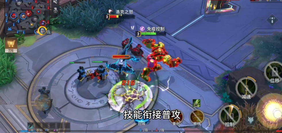 一技能怒气冲顶可根据敌我距离切换远程投石或近战摔打模式,前者用于消耗后者用于控制。二技能重拳裂地提供范围减速和物理伤害,是主要的清线与留人手段。大招无敌陷阵赋予伤害减免效果,配合防御装备能显著提升生存能力。技能释放后需利用被动加速贴近目标,衔接普攻最大化伤害。