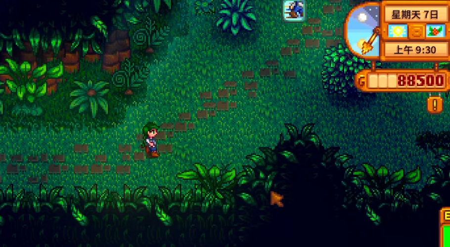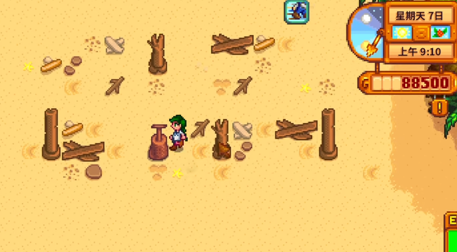 进入威利鱼店后,会发现一扇以往无法打开的门现在可以互动。穿过这扇门来到鱼店后方,能看到一艘破损的船只和售票机。修复这艘船需要准备三种材料:200个硬木用于修复船体,5个电池组修复售票机,5个铁锭制作船锚。硬木需要通过升级后的铁斧砍伐大木桩获得,秘密花园是获取硬木的最佳地点。电池组则需要通过避雷针在雷雨天气收集,制作避雷针需要铁锭、精炼石英和蝙蝠翅膀。