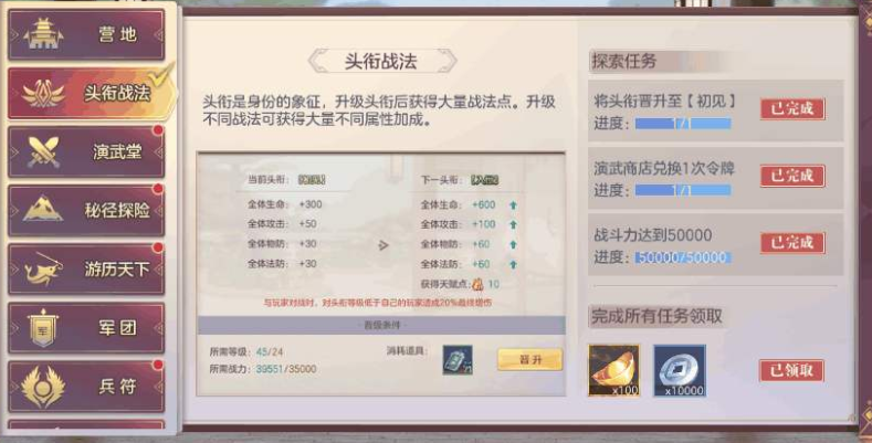 头衔晋升后会获得战法点,用于解锁三种战法:阵型基础、职业基础和阵营基础。阵型基础需要35个战法点全部解锁,职业基础需要78个点,阵营基础需要先投入42点到职业基础才能解锁。建议优先加点自己主力阵容对应的职业和阵营,这样能最大化提升战力。每次晋升都会带来属性加成翻倍效果,所以尽量保持头衔等级领先很重要。