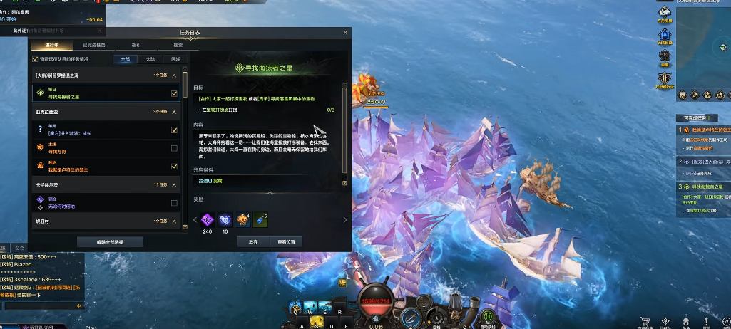 任务流程分为两个阶段:前置条件与核心目标。前置阶段要求玩家完成基础任务链以解锁航海协同任务的参与资格,这部分任务通常与阿尔泰因大陆的主线或支线剧情相关。核心目标则是参与并完成阿尔泰因航海协同中的钓宝箱环节,该环节会随机出现在航海协同任务轮换中,出现概率约为20%-30%,需多次尝试才能遇到。钓宝箱环节要求玩家在限定时间内通过迷你游戏机制打捞指定数量的宝箱,成功后可自动推进寻找海盗之星任务进度。