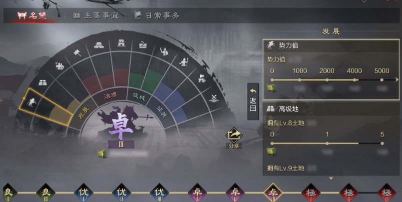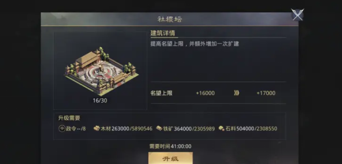 升级社稷坛的具体过程较为直观,但需要玩家逐步操作。在主城设施界面选中社稷坛后,选择升级按钮,系统会提示所需资源和时间。每次升级社稷坛,名望上限都会显著增加,初始阶段主城社稷坛的升级次数有限,达到满级后便无法再提升玩家应转向分城建设,因为分城的社稷坛同样能提供名望上限加成。建造分城的前提是名望值达到一定水平,并占领八块相邻的土地作为基础,这需要提前规划土地扩张和资源分配。整个过程强调策略性,玩家需平衡升级社稷坛与防御建设,避免资源浪费。