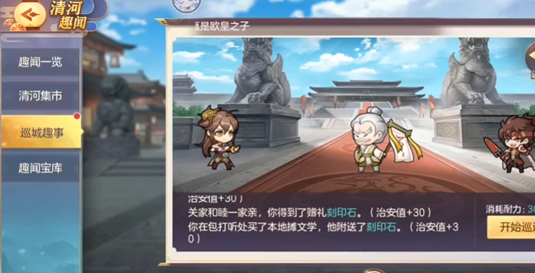 巡城趣事是一项周期性活动,玩家通过消耗耐力值巡逻不同区域积累治安值,并触发随机事件获取奖励。活动分为街道、港口、城郊三个巡逻地点,奖励类型与巡逻地点直接相关。街道主要产出刻印石和百炼石,港口提供高级与中级锻造石,城郊则偏向兵玉和精炼石。根据